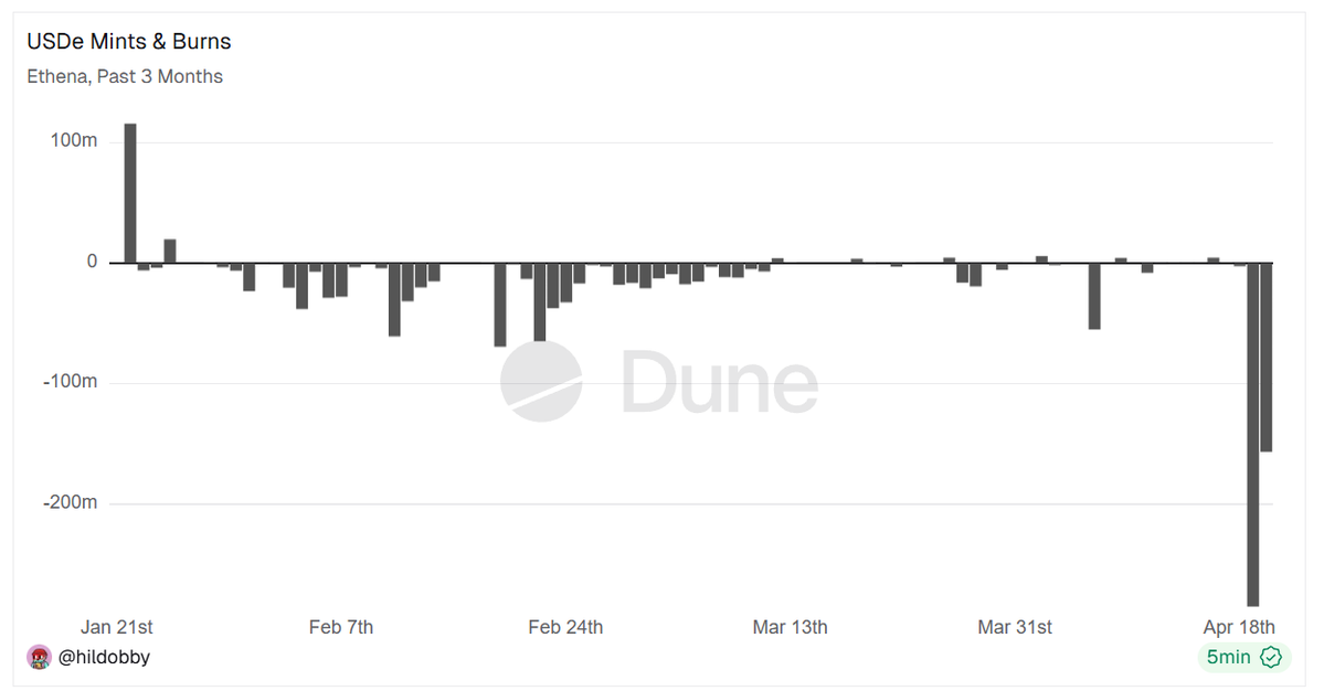 $rsETH fiasco hit Ethena pretty hard: $440m in $USDE redemption so far! 📊📉😮 Largest redemptions since launch of USDE by a wide margin! Many loopers unlooping 🔄 $ENA $AAVE https://t.co/pqmJHzTKtV
