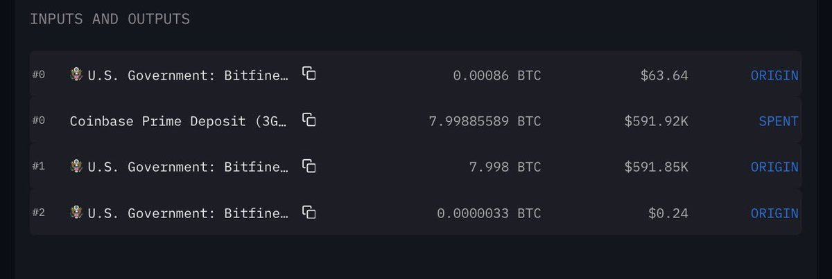 🚨 ABD hükümeti, Bitfinex hackerı Seized ‘dan kara para aklama suçlamasıyla elde ettiği yaklaşık 9 $BTC (600 bin dolar) ‘yi Coinbase üzerinden sattı. ABD’nin aylar önce suç gelirlerinden elde edilen #Bitcoin ‘leri hazineye aktarıp satış yapmayacağını duyurması sonrası sattığı 4. Posta oluyor. Trump her zamanki gibi yatırımcılara yalan söylemeye devam ediyor.