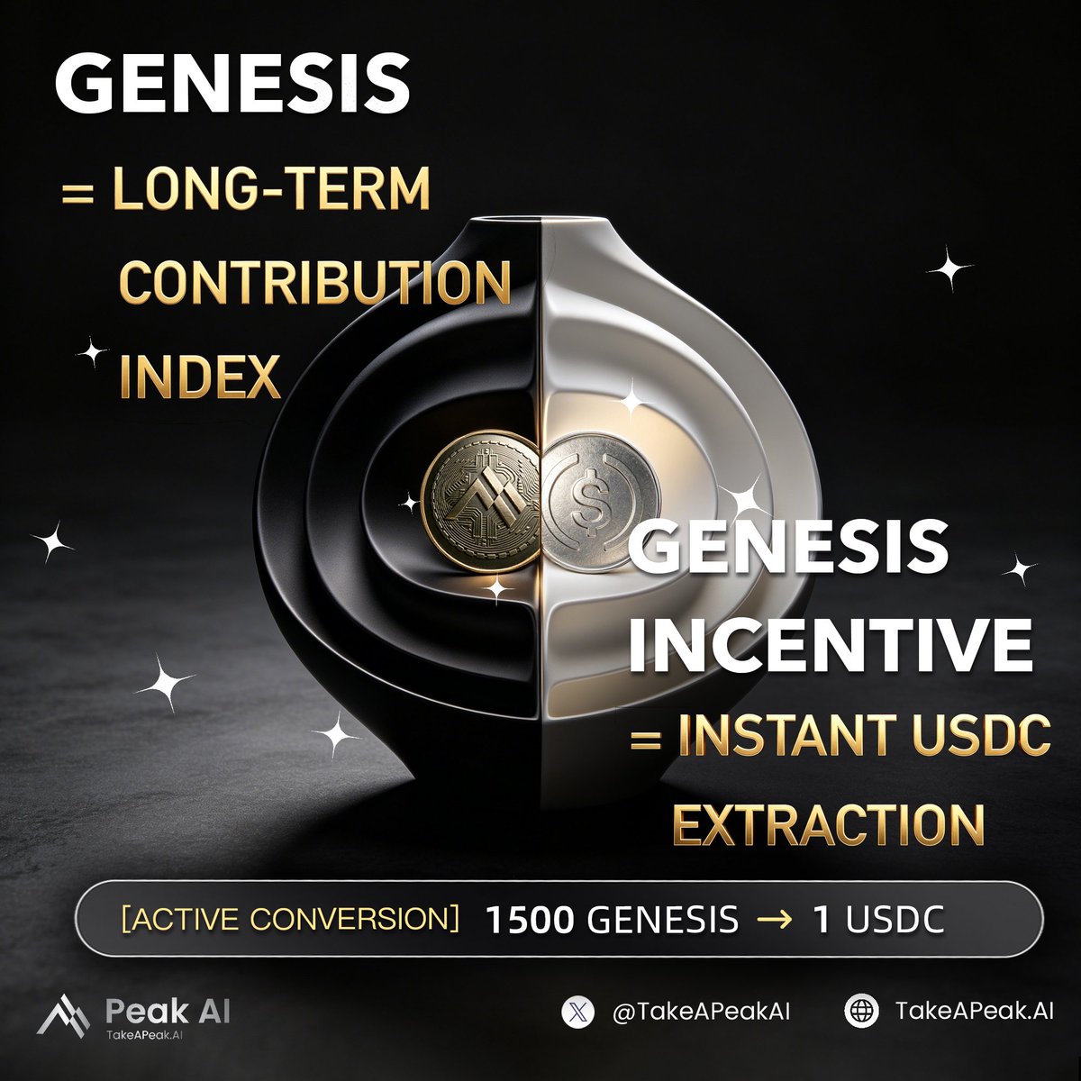 💎 Two Parallel Systems. One Unified Architecture. Genesis is the core points system of PeakAI. It quantifies active grid contribution and serves as the permanent credential for future allocation. Genesis Incentive is a short-term extraction window. Stage 1 capacity is critical: < $500 remains. Active nodes can still accelerate extraction of the residual pool by routing new invite to the protocol. Pool exhaustion does not halt the matrix. Genesis accumulation is permanent. Continuous grid expansion secures long-term structural mass, regardless of temporary liquidity phases. Extract the yield. Inherit the network. https://www.takeapeak.ai/genesis
