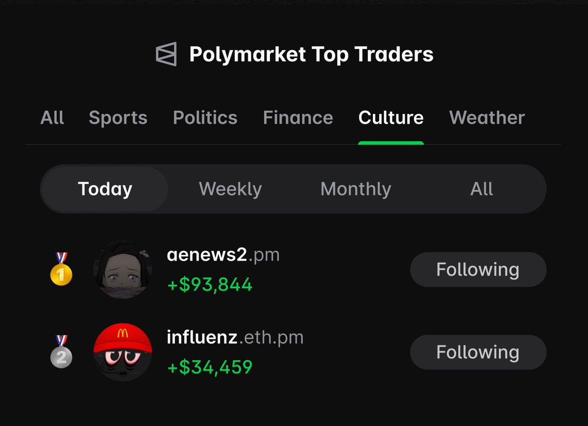 .@aenews & @influenzEth spotted at the top of the daily Polymarket leaderboard for culture markets 👀 https://t.co/TlokZPk1S4