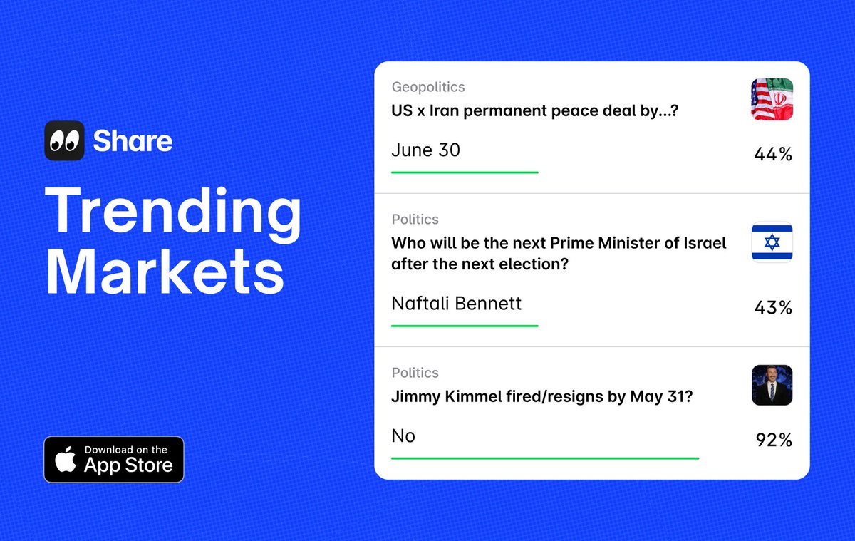 Trending markets right now on Share 🔥 → US x Iran permanent peace deal by June 30: 44% → Naftali Bennett next Israeli PM: 43% → Kimmel out by May 31: 92% No Download Share to trade Polymarket from your phone https://t.co/sAGU9D7UYf