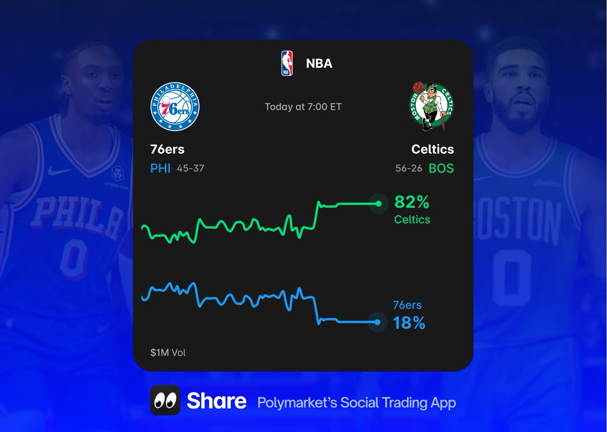 Here's what the market is saying about tonight's upcoming 76ers vs. Celtics playoff game 🏀 The @Polymarket odds have the Celtics at 82% and 76ers at 18%. Boston currently leads the series 3-1. Trade the NBA playoffs on Share 👇 https://t.co/OVGsdDNhFW